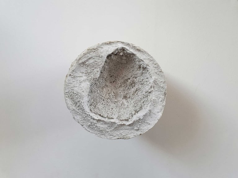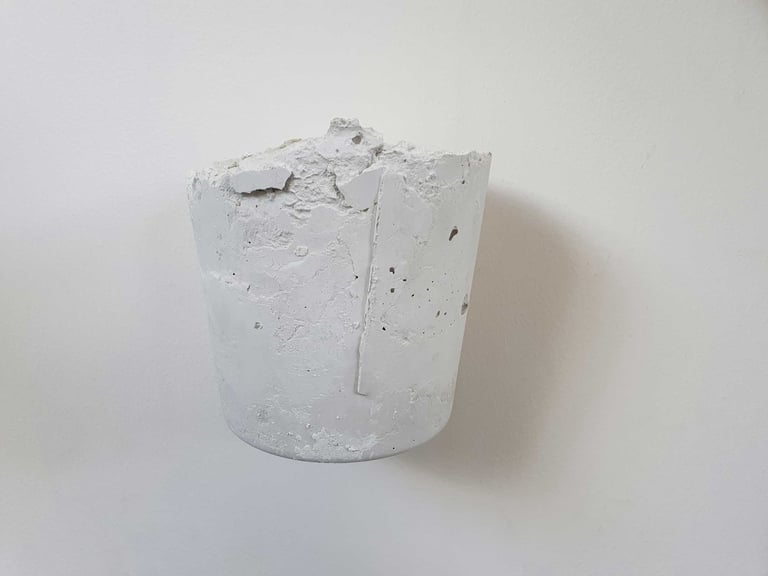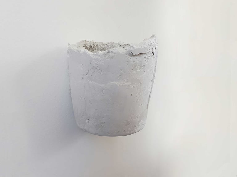 Some chalk is poured in a bucket filled with snow, insinuating between the snowflakes and creating an alveolar structure. Once the snow is melted, what we’re left with are the casts of the buckets,
